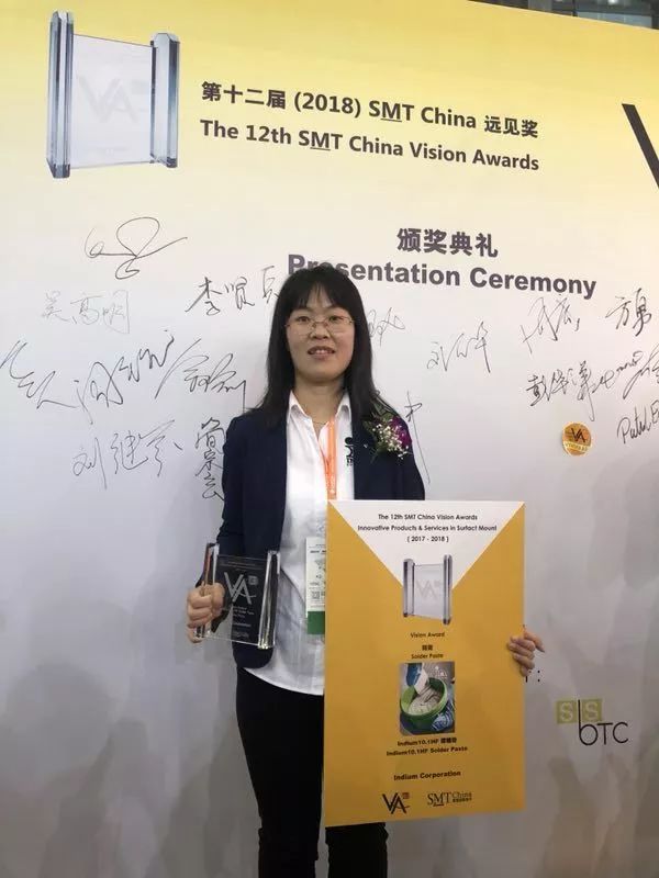 在第二十八屆中國(guó)國(guó)際電子生產(chǎn)設(shè)備暨微電子工業(yè)展(NEPCON China)期間,我們斬獲了多項(xiàng)大獎(jiǎng)。我們的Indium10.1HF 焊錫膏榮獲了SMT China 遠(yuǎn)見獎(jiǎng)(SMT China Vision Award)和EM Asia 創(chuàng)新獎(jiǎng)(EM Asia Innovation Award),此外,我們的化學(xué)研究員馬麗榮獲SMTA華東高科技技術(shù)研討會(huì)2018的最佳論文獎(jiǎng)。(論文詳情參見此處)